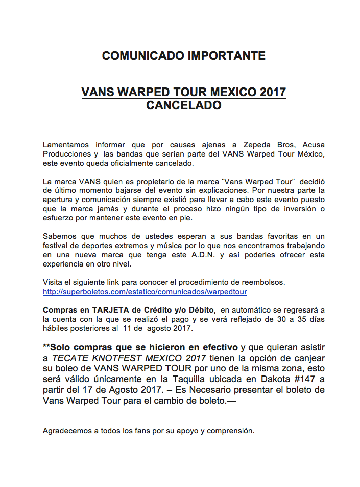 Se Cancela el Vans Warped Tour MexicoVliss Magazine9 ago 20171 Min. de lectura Si. El festival se canceló y realmente nadie sabe por qué. Checa toda la info sobre los boletos y el comunicado aqui. #vanswarpedtour